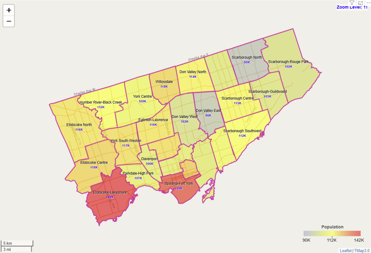 You can add 5 reference layers to TMap at most. The following is an example map including top symbol layer (population), linked polygon layer (wards) and 3 reference layers (main roads, parks and recreation facility study area, and air conditioned and cool spaces) for the City of Toronto, Canada.