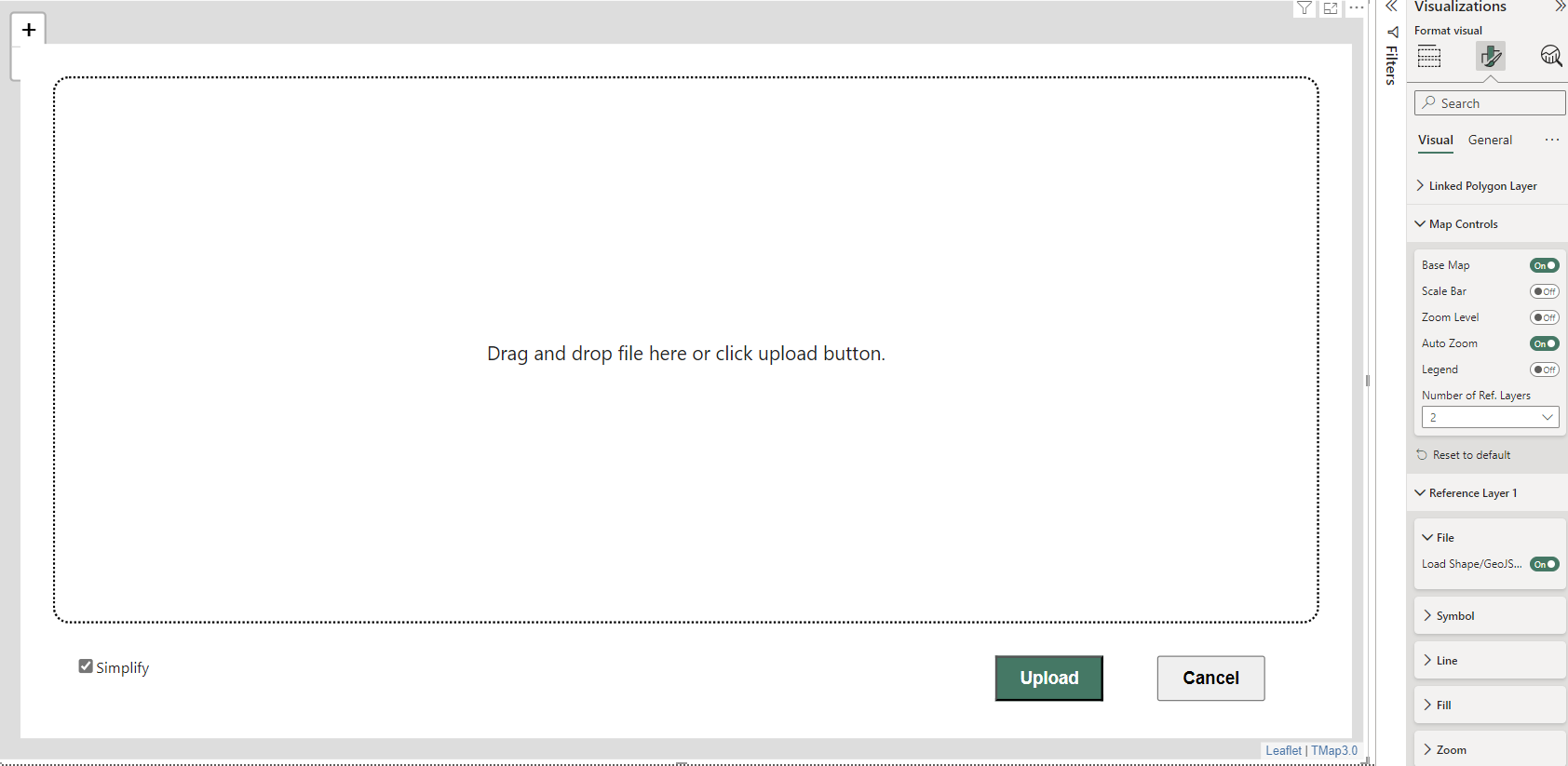 If you want to remove or replace a reference layer from the TMap visual, just go to the reference card with the loaded file name in the format pane and click "Load Shape/GeoJSON File" in the file group, the following window will be shown on the map.