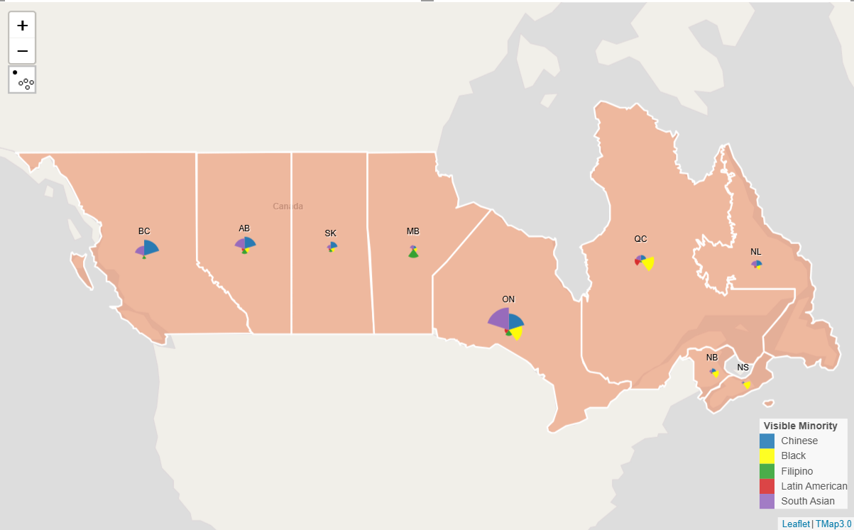 The following map shows pie chart of visible minorities for each province in Canada after clustering: